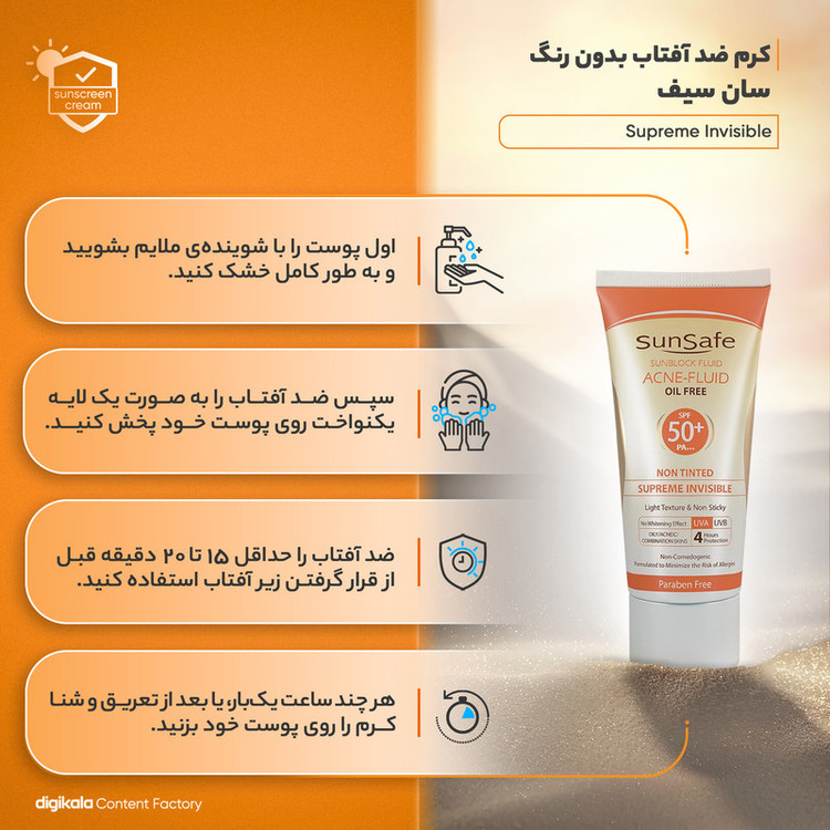 ضد آب , محافظت کننده در برابر اشعه UVA , محافظت کننده در برابر اشعه UVB , غیر کومدون زا , فاقد پارابن