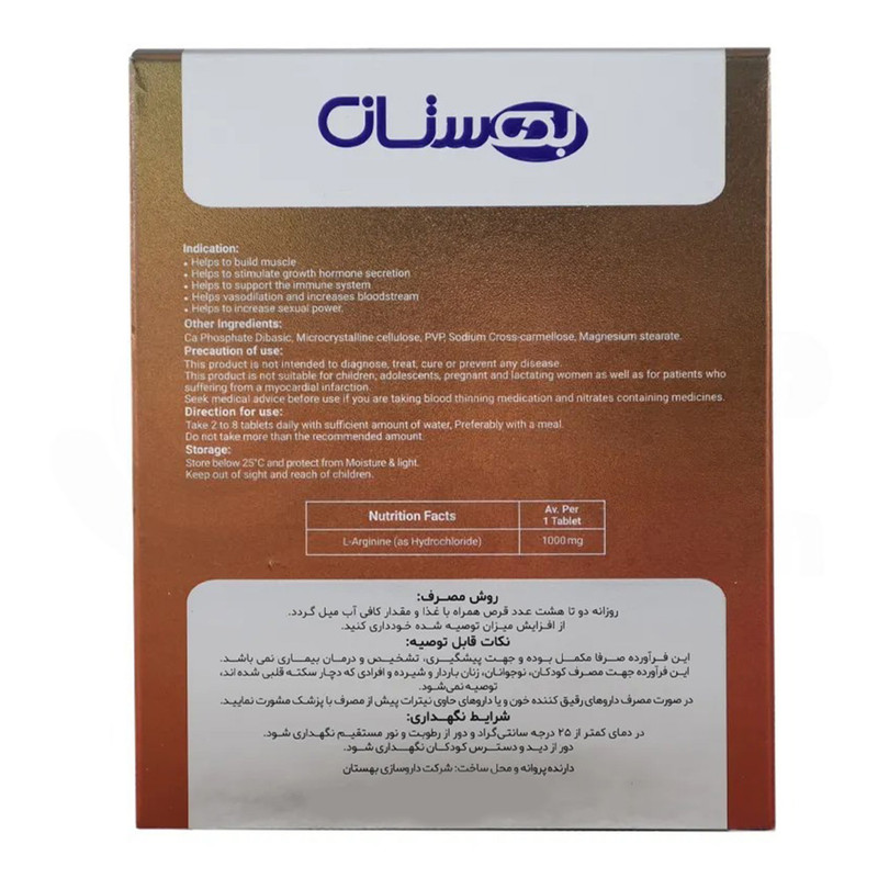 روش مصرف: برای کمک به عضله سازی، افزایش کارایی ورزشکاران، بهبود گردش خون، تقویت ایمنی و قوای جنسی، روزانه 2 تا 8 قرص ال آرژنین همراه با غذا مصرف شود.
