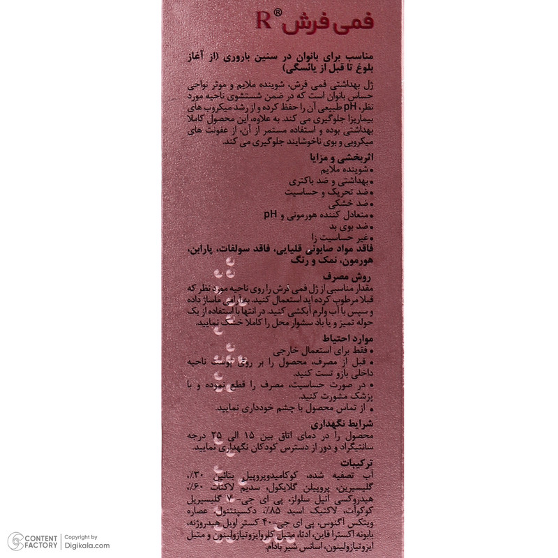 این محصول فاقد سولفات، پارابن و صابون است. از مزایا این ژل میتوان به ضد باکتری، ضد خشکی و ضد تحریک بودن اشاره کرد.